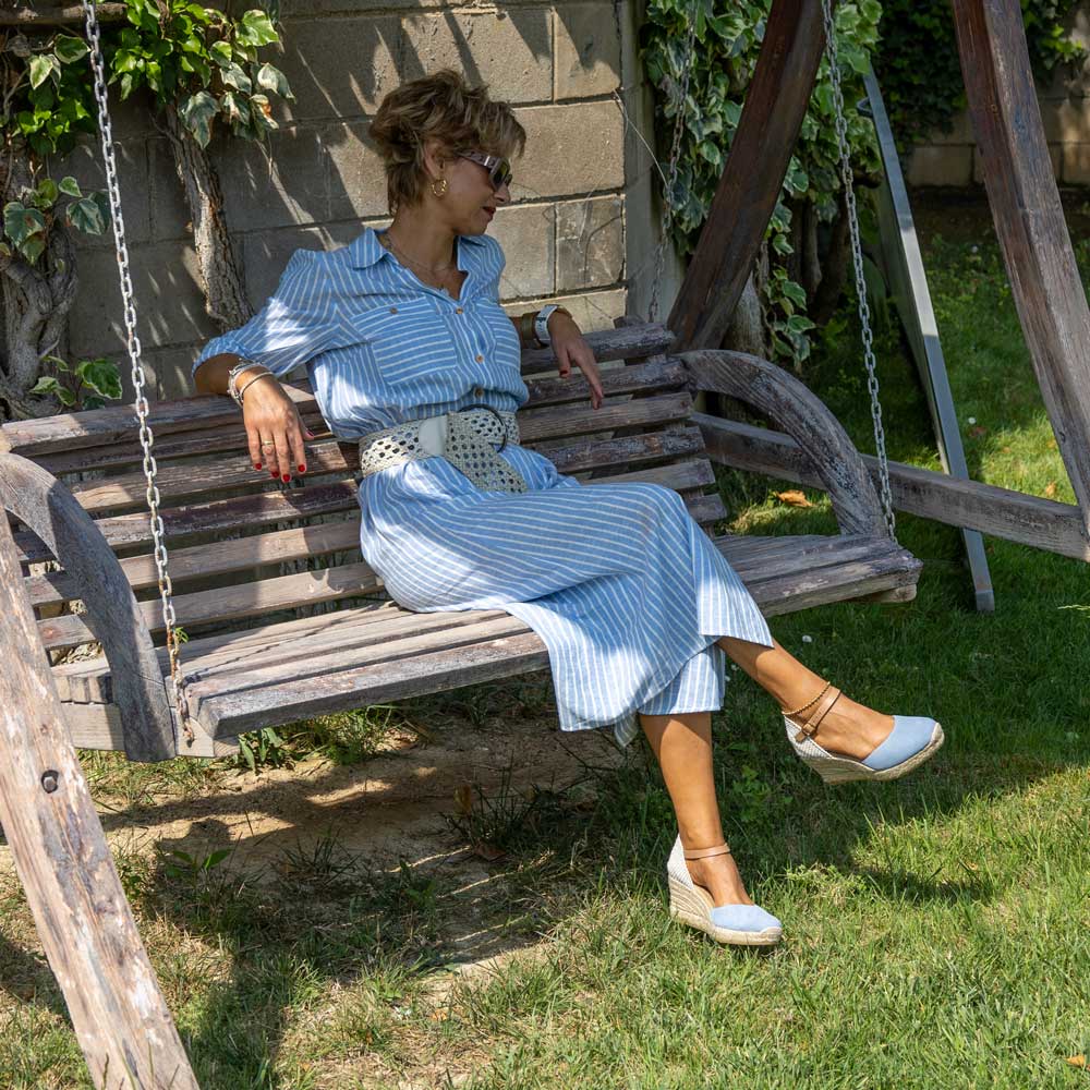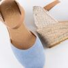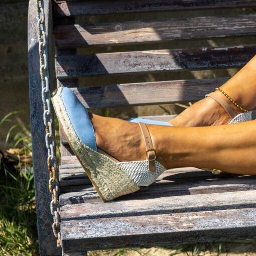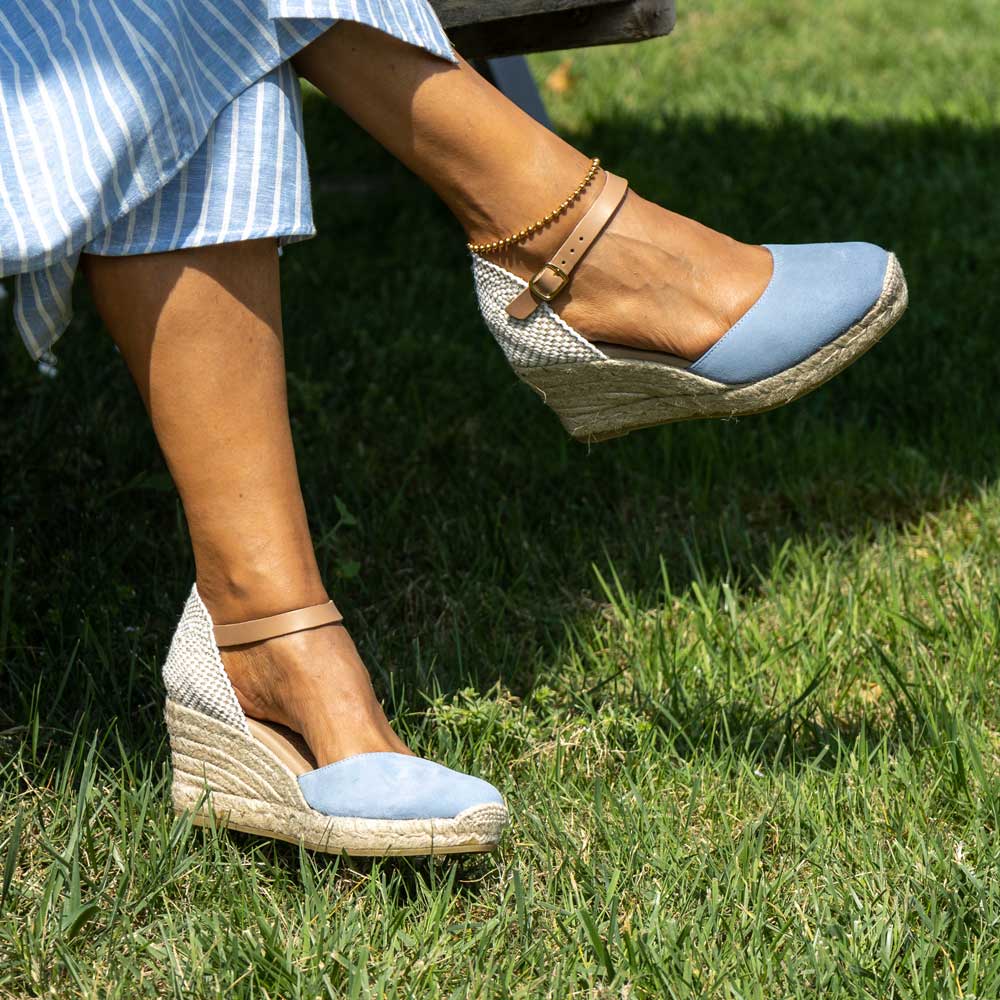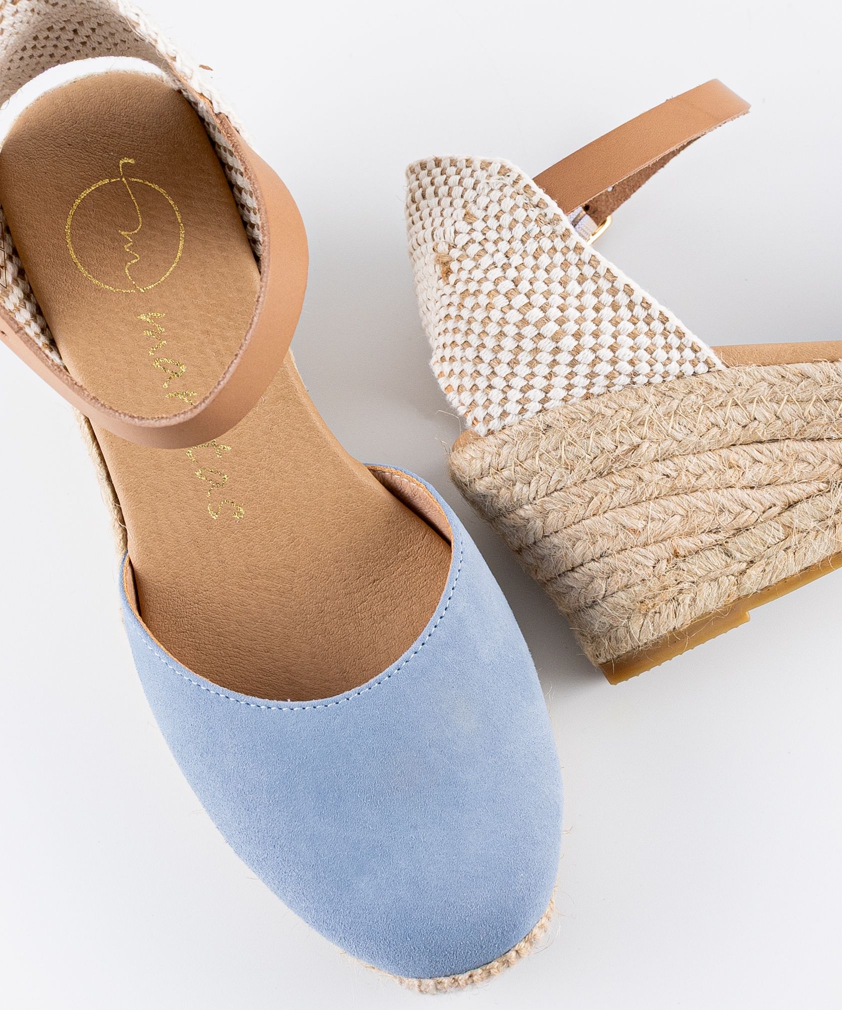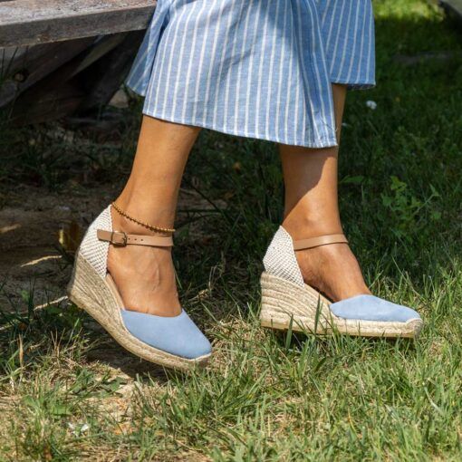 Alpargata con cuña elaborada en serraje. Suela vulcanizada de yute teñido y caucho, forrada con microfibra y plantilla cómoda, ofreciendo mayor comodidad al caminar. Altura de 7 cm, cuña de 5 cm y plataforma de 2 cm. Hechas totalmente a mano en España.