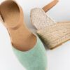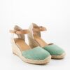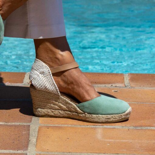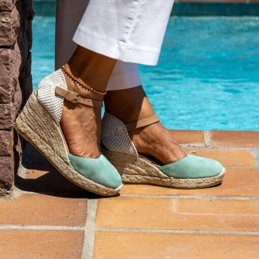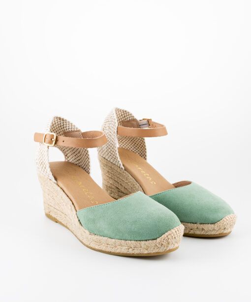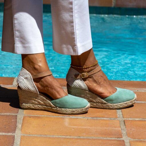Alpargata con cuña elaborada en serraje . Suela vulcanizada de yute teñido y caucho, forrada con microfibra y plantilla conford, ofreciendo mayor comodidad al caminar. Altura de 7 cm, cuña de 5 cm y plataforma de 2 cm. Hechas totalmente a mano en España.